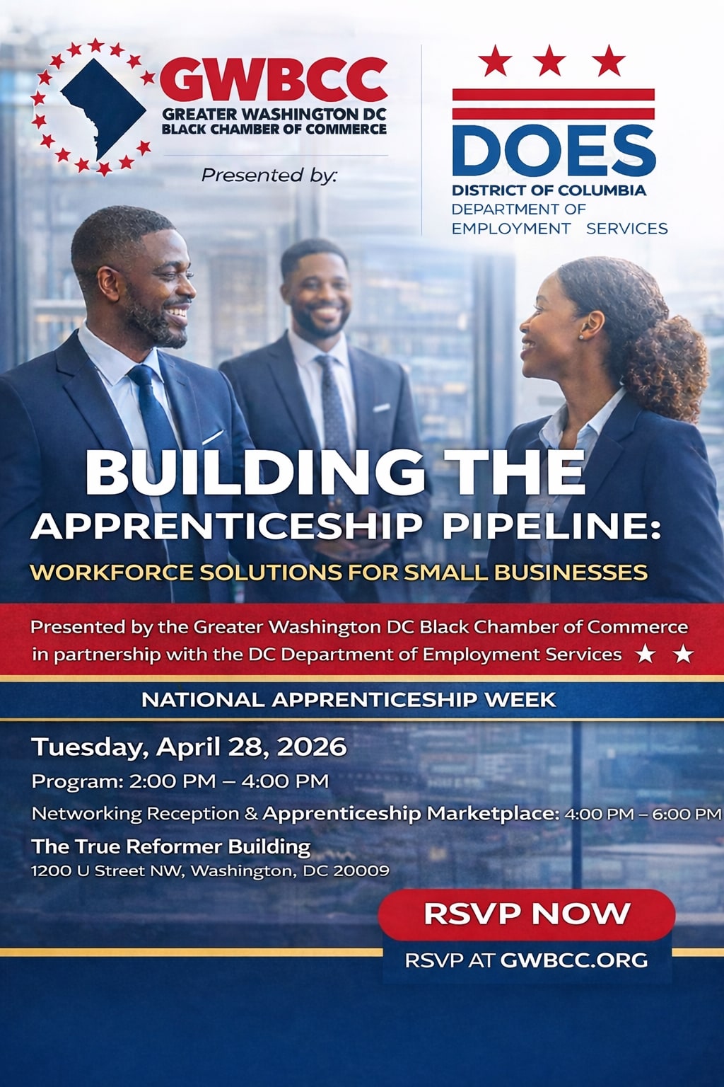 The Greater Washington DC Black Chamber of Commerce, in partnership with the DC Department of Employment Services, invites business owners, workforce leaders, policymakers, and community stakeholders to Building the Apprenticeship Pipeline, a dynamic, solutions-oriented convening focused on how apprenticeships can serve as a scalable and sustainable workforce strategy.