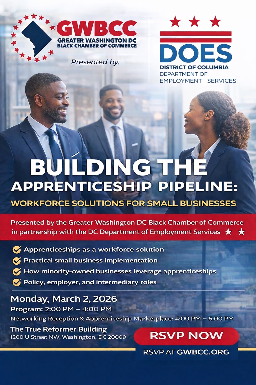 The Greater Washington DC Black Chamber of Commerce, in partnership with the DC Department of Employment Services, invites business owners, workforce leaders, policymakers, and community stakeholders to Building the Apprenticeship Pipeline, a dynamic, solutions-oriented convening focused on how apprenticeships can serve as a scalable and sustainable workforce strategy.