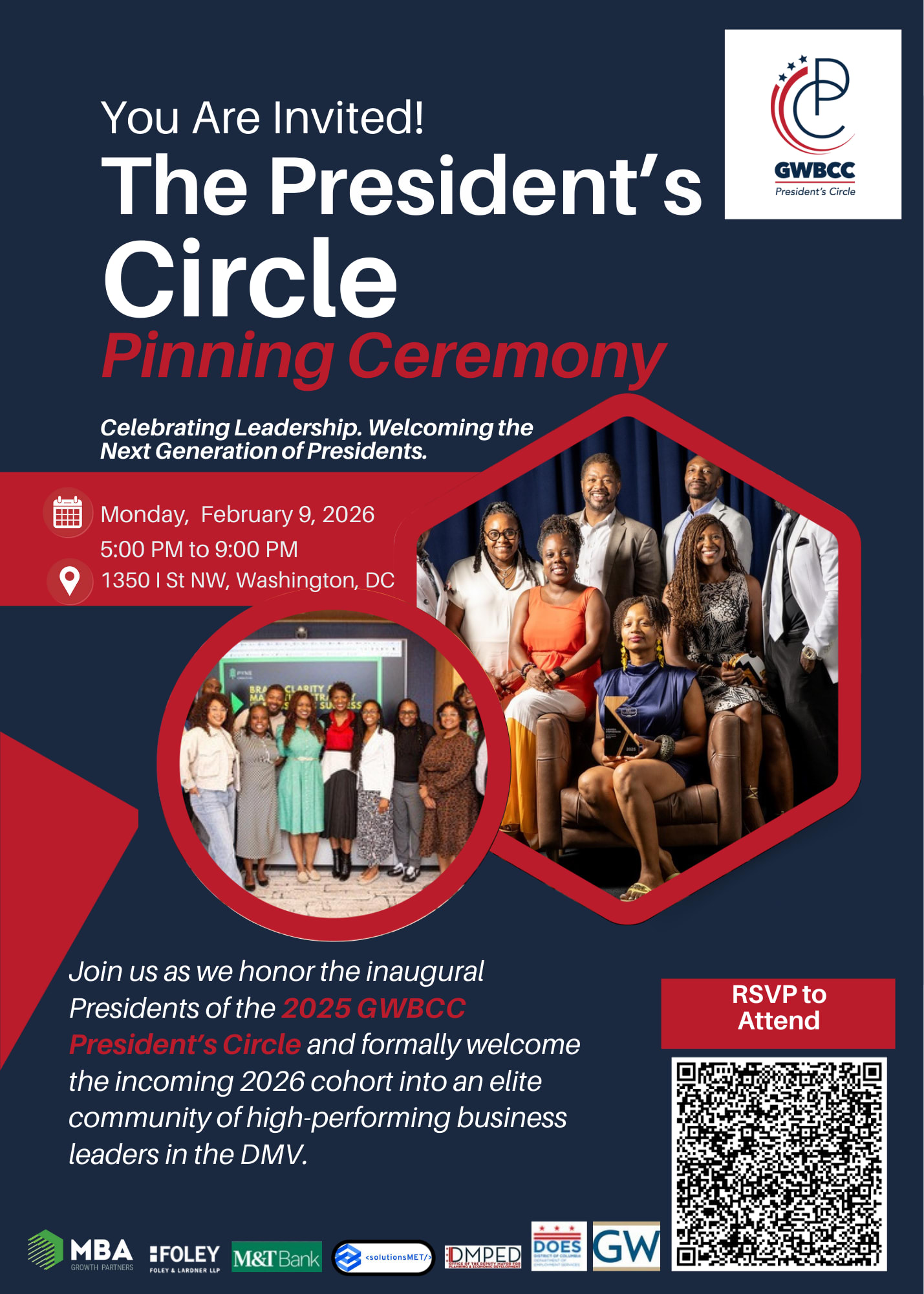 Networking with regional business, government, and civic leaders GWBCC Annual Meeting and strategic outlook President’s Circle Cohort Pinning Ceremony Recognition of corporate, legal, and government partners Light refreshments and facilitated networking
