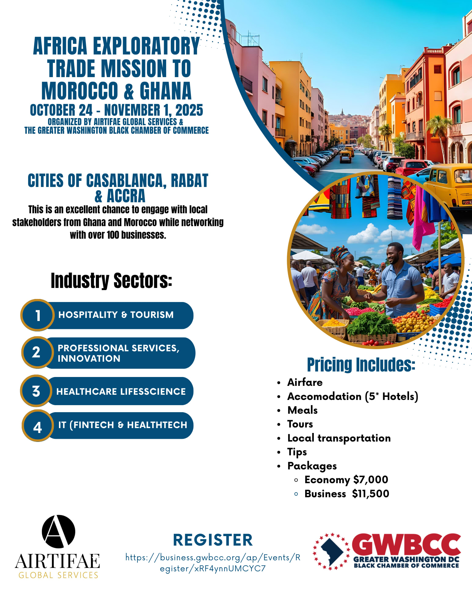 Interested in expanding your business globally? Join us as we explore emerging trade opportunities in Morocco and Ghana! By registering your interest, you’ll receive early access to details about the Africa Exploratory Trade Mission, including: