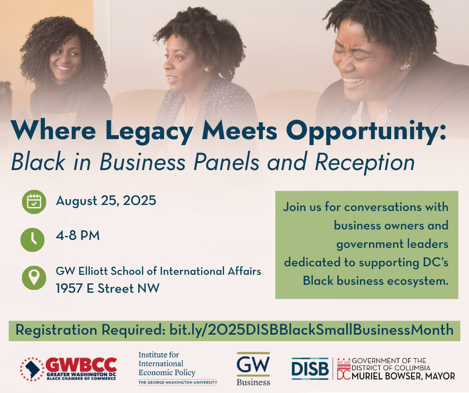 In celebration of Black Small Business Month, observed every August, the Greater Washington DC Black Chamber of Commerce (GWBCC), in partnership with the George Washington University and the DC Department of Insurance, Securities & Banking (DISB), invite you to Black in Business: Where Legacy Meets Opportunity—an empowering evening focused on financial education and access to capital.